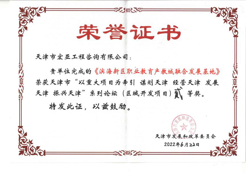 基地》項目榮獲天津市發展和改革委員會頒發的天津市“以重大項目為牽引 謀劃天津 經營天津 發展天津 振興天津”系列論壇(區域開發項目)貳等獎。