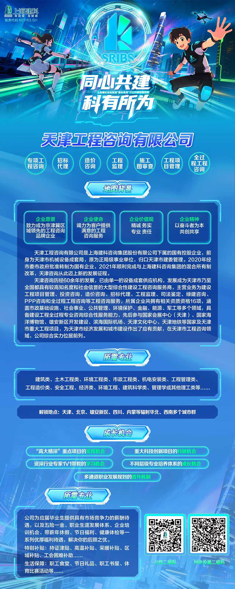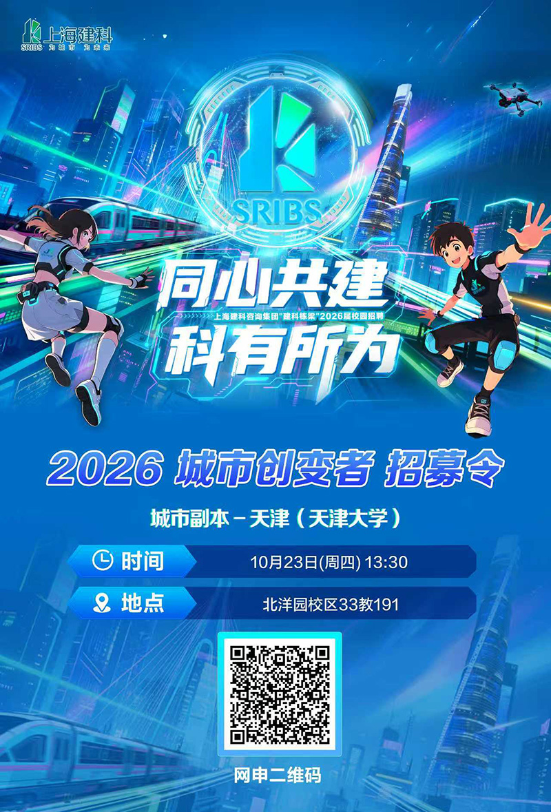 同心共建 科有所為天津工程咨詢有限公司啟動2026屆校園招聘 更新時間:2025-10-22 點擊:219 所屬欄目:公司新聞 誠邀2026屆畢業生參加城市專場宣講會(天津大學) 簡歷投遞方式 郵箱:tec_hr@sribs.com 電話:022-88365660 “我與天津咨詢的相遇” 2026屆校園招聘主題vlog