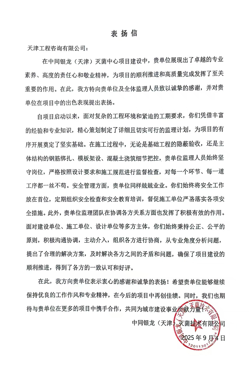 天津華勘穗金房地產公司、中同銀龍(天津)公司也先后發來表揚信,對天津咨詢河東金貿產業園區11-D、15號項目團隊和中同銀龍(天津)滅菌中心建設項目的監理工作予以表揚感謝,認為我司項目監理部積極主動對接業主需求,溝通協調參建各方,過程中加強技術管理支撐和質量安全風險防控,用“事事落地、件件閉環”的擔當,筑牢項目落地的責任防線,用實際行動詮釋了優質監理服務的內涵。