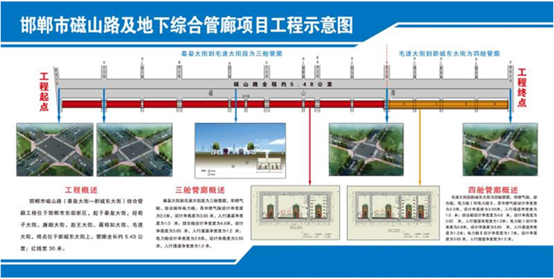 邯鄲市磁山路及地下綜合管廊(秦皇大街-新城東大街)工程,邯鄲市磁山路位于邯鄲市東部地區,起于秦皇大街,經荀子大街、廉頗大街、趙王大街、藺相如大街、毛遂大街,終點位于新城東大街上,路線全長約5.48公里。投資額6.8億元